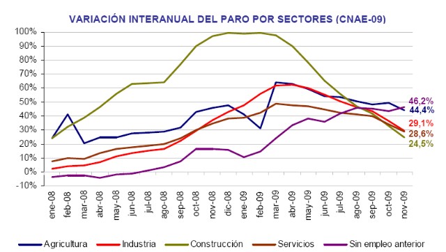 Sectorialmente, es el sector sin empleo anterior el que más aumenta en tasa interanual el paro registrado (46,2%; +98.881), seguida de la agricultura (44,4%; +33.842), industria (29,1%; +112.230), servicios (28,6%; +497.694) y construcción (24,5%; +143.031). "En menos de seis meses, la construcción pasa de liderar las tasas de incremento del paro a ser el sector que menos crece", destaca el estudio.