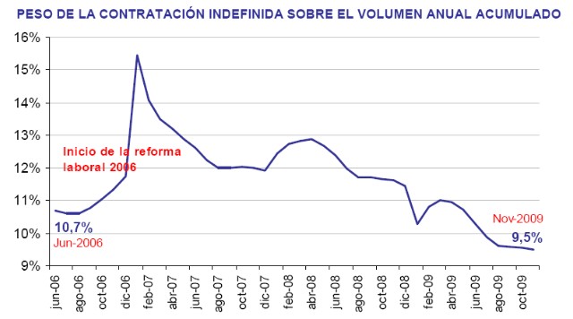 En primer lugar, el volumen de contrataciones en términos acumulados (entre enero y noviembre) asciende a 12,9 millones de contratos, de los que apenas el 9,5% han sido de carácter indefinido. "Este reducido peso de la contratación estable sobre el total de contratos es la más reducida desde diciembre de 2005", añaden los expertos.