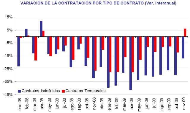 De este modo, los datos muestran que es "la contratación temporal la que está reactivando el mercado laboral". Los contratos temporales crecen respecto al año anterior (63.116 nuevos contratos) por primera vez desde abril de 2008, lo cual permite que el conjunto de la contratación también aumente (41.413). Los contratos de duración determinada no crecían interanualmente en un mes de noviembre desde antes de la crisis (noviembre 2006).