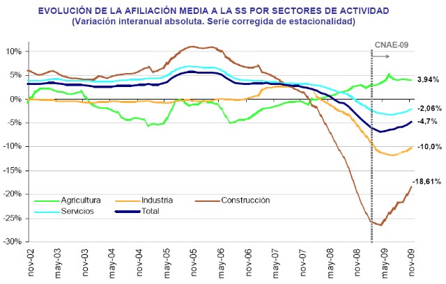 Todos los sectores, sin excepción, destruyen empleo. Servicios toma el relevo a la construcción y pasa a ser el sector que más empleo destruye. Este sector es causante del 38,7% del total del empleo perdido, perdiendo 23.738 afiliados, aunque destruye empleo a menor ritmo (-0,2%) que los demás sectores (construcción -1,1%; agricultura -0,9% e industria -0,3%).