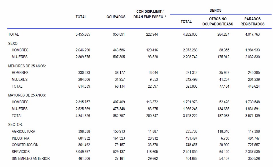 Además, tampoco incluye en las listas a los 222.944 desempleados agrupados bajo el título de demandantes de empleo con "disponibilidad limitada" o"demanda de empleo específica". Estas personas, según afirma el antiguo INEM, "son aquellos demandantes, sin empleo, que indican en su solicitud condiciones especiales de trabajo". Es decir, que son también parados.