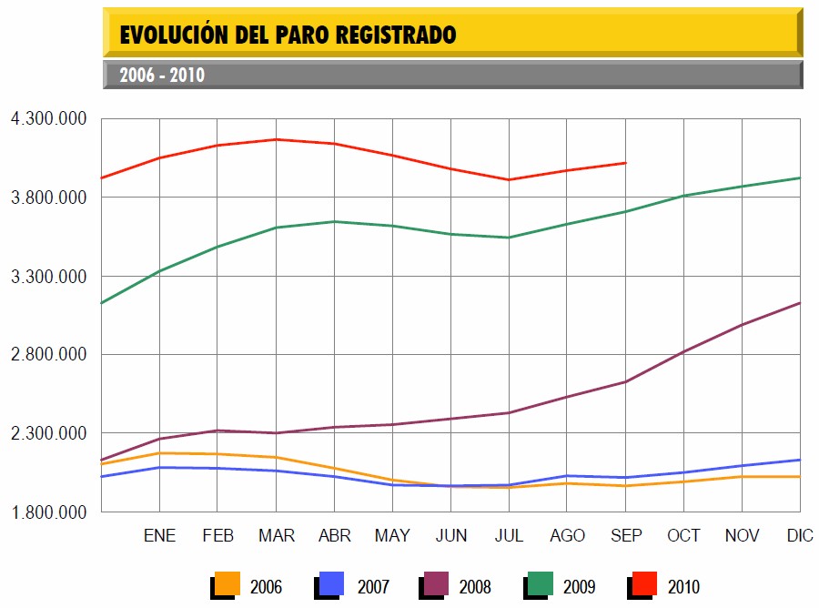 La subida del paro el pasado mes, en el que suele aumentar el desempleo, es, sin embargo, inferior a la registrada a septiembre de 2009, cuando subió en 80.367 personas. En los últimos 12 meses, el paro se ha incrementado en 308.316 personas, un 8,31% interanual.