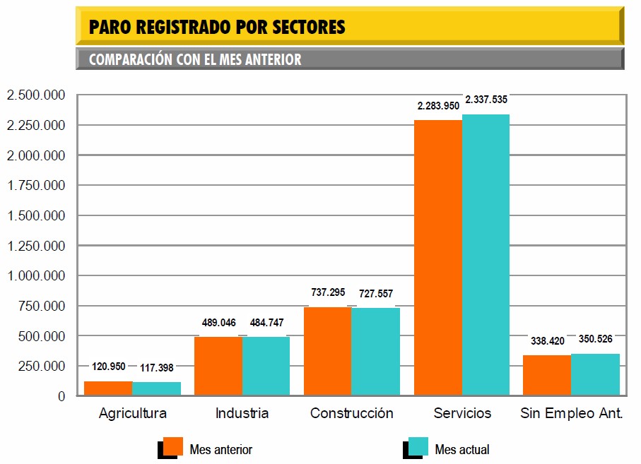 El desempleo bajó en tres sectores económicos: en la construcción descendió en 9.738 personas (-1,3%), en la industria se redujo en 4.299 personas (-0,9%), y en la agricultura cayó en 3.552 personas (-2,9%). Por el contrario, se registraron incrementos del paro en los servicios, con 53.585 parados más (+2,3%) y en el colectivo sin empleo anterior, donde el desempleo aumentó en 12.106 parados (+3,5%).