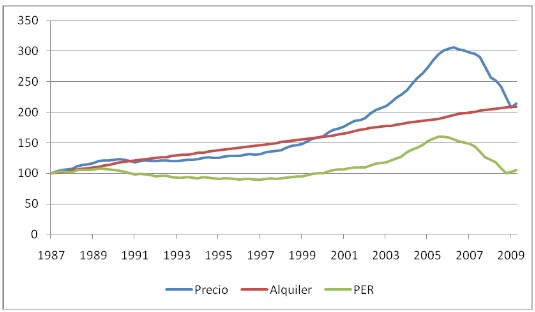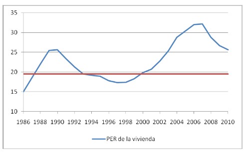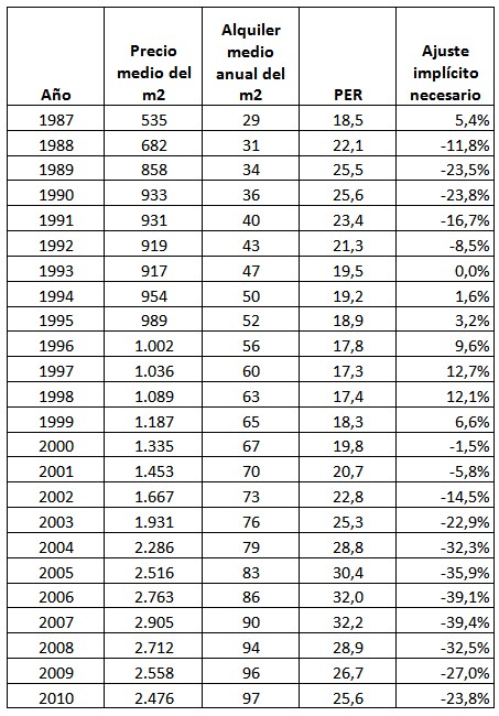 El precio medio del metro cuadrado de la vivienda se situó en los 2.476 euros en 2010, mientras que el alquiler medio por metro cuadrado alcanzó los 97 euros. De este modo, el PER de la Vivienda (número de años que se necesitaría alquilar un inmueble para recuperar el monto inicial de la inversión) se situó en 25,6 el pasado año, todavía lejos de su media histórica (PER de 19,5).
