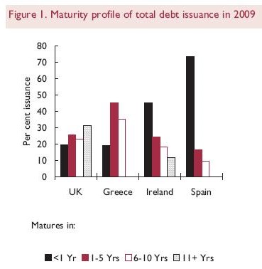"Mucha, mucha deuda a corto, sobre todo la emitida en 2009, incluso comparando con otros PIIGS", en referencia a Portugal, Italia, Irlanda, Grecia y España. En concreto, "el 70% de la deuda española emitida en 2009 fue a menos de 1 año", indica.
