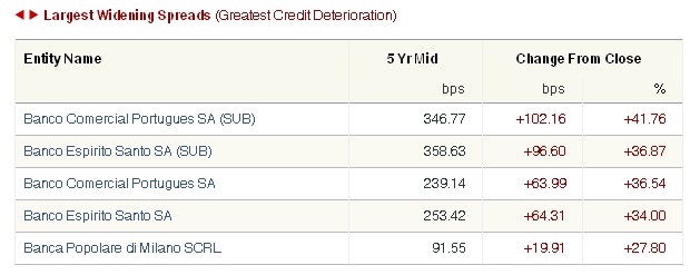 Asimismo, los CDS griegos cotizan este viernes en 444,7 puntos básicos, nuevo récord histórico. Por úlitimo, en el caso de Portugal suben de 229,5 a 238 puntos, y con ellos también los CDS de los bancos portugueses.