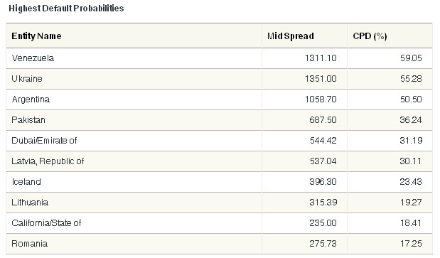 Venezuela, Ucrania y Argentina lideran el ranking con una probabilidad de quiebra superior al 50%; le siguen Pakistán, Dubai y Letonia , con una riesgo superior al 30%; Islandia (23,4%); Lituania (19,3%); California (18,4%) y Rumanía (17,2%).
