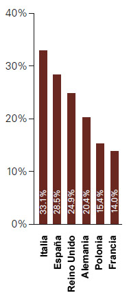 Esto es lo que se conoce como el tipo efectivo de los impuestos sobre la renta. Pues bien, España es el quinto de los seis grandes países de la UE con mayor tipo efectivo para ese nivel de ingresos: un 28,5%, frente al 14% de Francia o de Polonia. Sólo Italia con un 33,1% le supera.