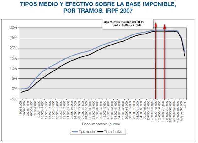 Pero además, como una parte mayor de sus ingresos vienen por las rentas del capital (que tributan menos, como explicábamos más arriba), a partir de los 144.000 euros, el tipo medio y el efectivo sobre la base imponible total empiezan a bajar (según un informe del BBVA que utiliza las cifras del IRPF entre 2003 y 2007).