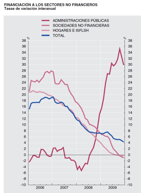 Es decir, el escaso crédito que conceden bancos y cajas es acaparado casi en su totalidad por el sector público. De este modo, España sufrió en 2009 un doble fenómeno: restricción del crédito (credit crunch) y efecto expulsión del sector privado (crowding out). Y todo indica que la situación se agravará en 2010, ya que el Estado necesita colocar un mínimo de 225.000 millones de deuda en 2010 -si se suma el vencimiento de bonos y las necesidades netas de financiación-.