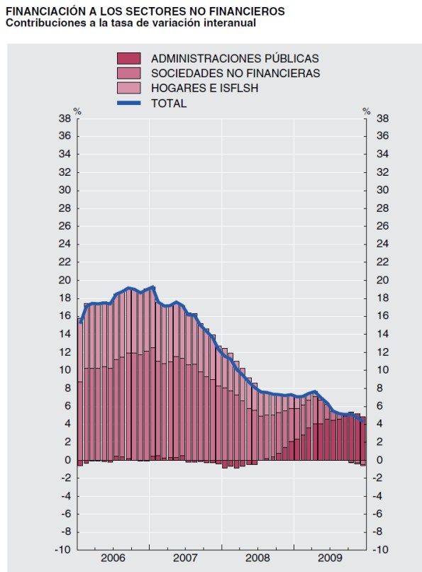 De este modo, el aumento del crédito en 2009 (4,3%) está “determinada en su totalidad por las necesidades de financiación del déficit de las administraciones públicas españolas”, indica. La contribución por sectores lo deja muy claro: mientras que el crédito destinado al sector público avanza un 4,9% interanual, las contribución de los préstamos concedidos a empresas y familias ha sido negativa (-0,5% y -0,1%, respectivamente).