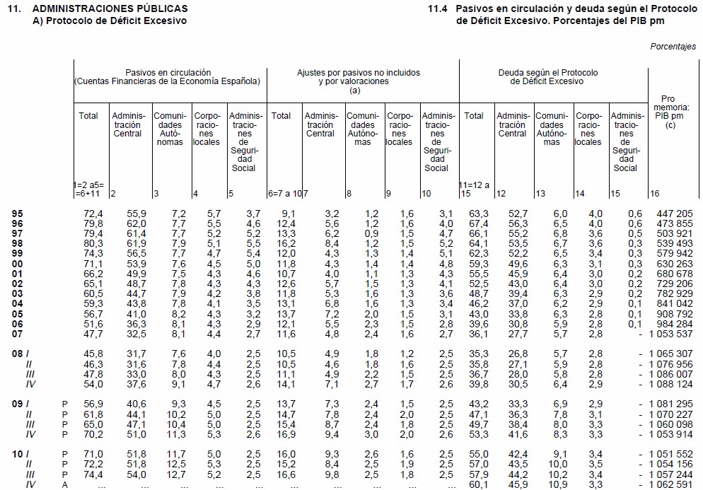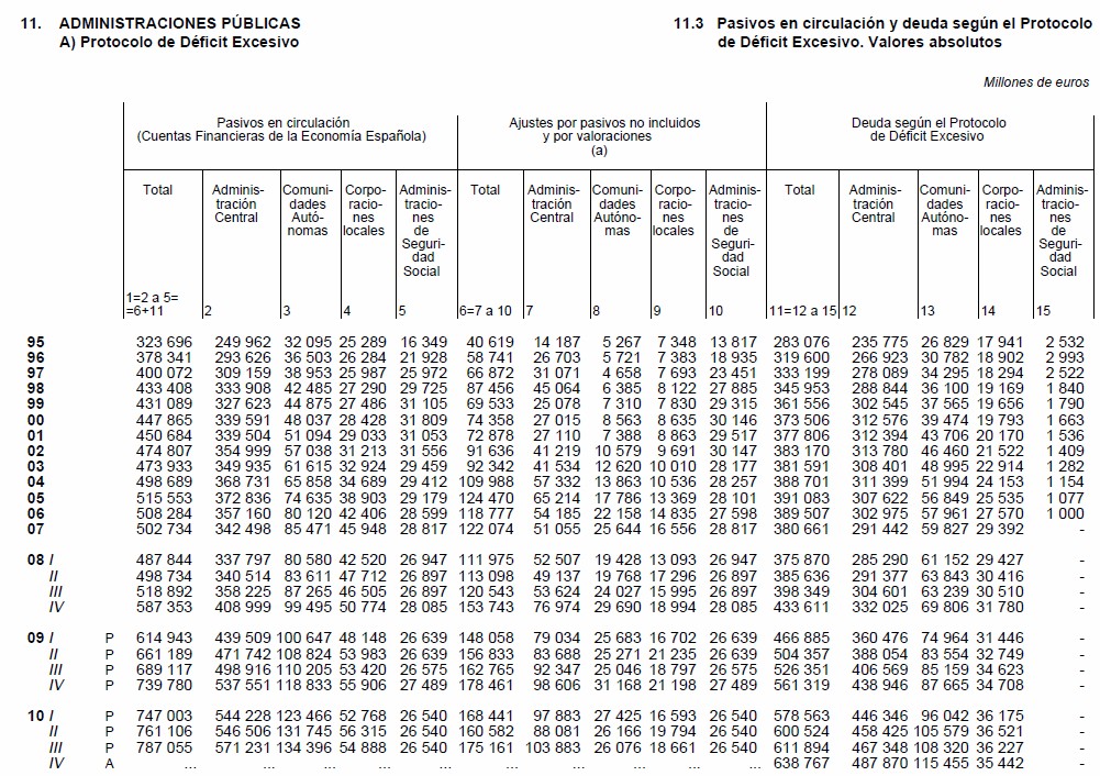 Sin embargo, dicho crecimiento interanual no refleja en toda su intensidad el espectacular endeudamiento público a lo largo de los últimos años. El Gobierno insiste en que España sigue teniendo uno de los niveles de deuda pública más bajos de la UE, pero elude explicar el gran deterioro presupuestario que sufren las cuentas públicas españolas desde 2007, cuando comenzó la crisis económica.