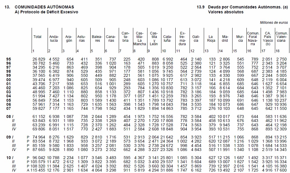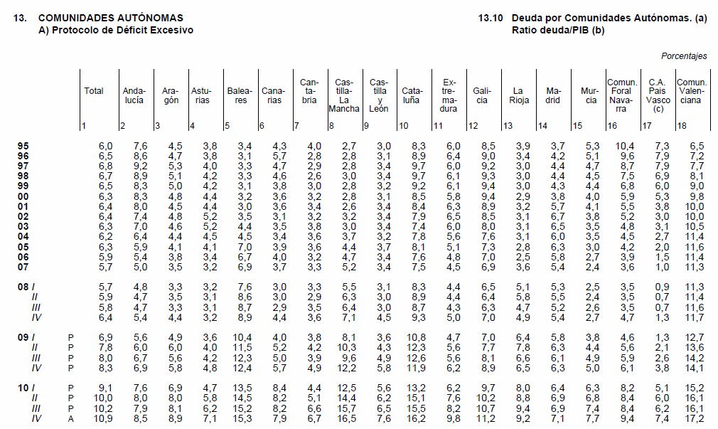 Asimismo, la deuda de las CCAA aumentó un 31,7% interanual en 2010, hasta alcanzar los 115.455 millones de euros (el 10,9% del PIB), la cifra más alta de toda la serie histórica. Desde 2007, la deuda autonómica ha crecido en 55.628 millones de euros, un 92,3% más. Es decir, las CCAA casi han duplicado su deuda desde el comienzo de la crisis, al pasar del 5,7% del PIB en 2007 hasta el 10,9% en 2010.