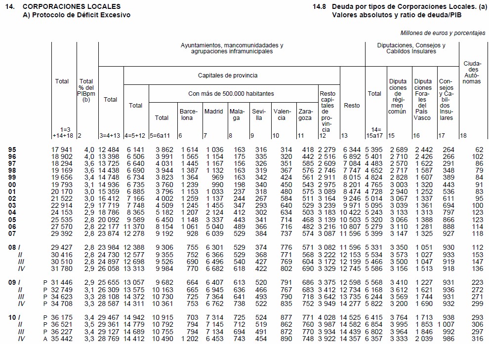 Por último, la deuda de las corporaciones locales (ayuntamientos, mancomunidades y diputaciones) se elevó hasta los 35.442 millones de euros en 2010, un 2,1% interanual más. Desde 2007 ha crecido en 6.050 millones, un 20,6% más, al pasar del 2,8% del PIB hasta el 3,3% actual.