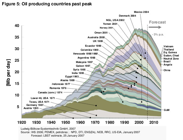 Esta gráfica superior corresponde a la producción acumulada de los 33 principales países productores que han pasado ya su punto de máxima producción o peak oil. Destacan especialmente los declives de EEUU, México, Reino Unido y Noruega.
