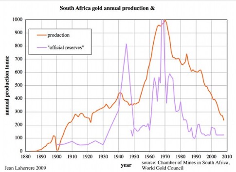 Con la producción mundial de oro sucede algo idéntico. Y el ejemplo más claro al respecto es Sudáfrica, donde el agotamiento progresivo del recurso impide aumentar la producción a pesar de las nuevas y abundantes inversiones. Ya dijimos en su momento que el agotamiento del oro estaba suficientemente demostrado y era una cuestión aceptada por todos los expertos del sector. Con el petróleo sucede lo mismo y ya nadie discute el hecho de su agotamiento con disponibilidad normalizada ni en las más altas esferas políticas nacionales o internacionales.