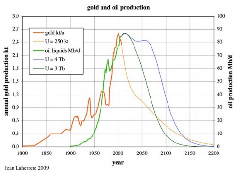 En la gráfica siguiente se comparan la disponibilidad futura del oro y del petróleo, considerándose en este segundo caso un escenario base de 3 Tera barriles (Tb) totales de crudo extraíble en verde oscuro, y otro más optimista un 33% superior de 4 Tb en azul. Obsérvese cómo el segundo escenario consigue desplazar unos 40 años el máximo de producción, pero el declive final es igualmente inevitable.