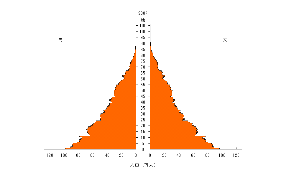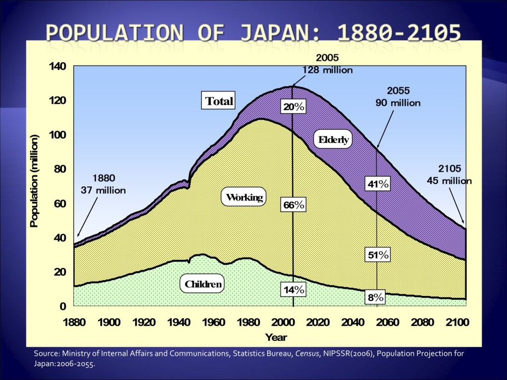 El caso paradigmático para analizar es el de Japón, por ser uno de los primeros en experimentar el fenómeno que estamos explicando. Tradicionalmente se han representado las poblaciones estructuradas en pirámides, que se podían ensamblar de forma móvil para ver su evolución en el tiempo. En la gráfica inferior el color rojo aparece cuando la población comienza a disminuir.