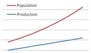 Aún hoy en día, cuando se habla de demografía, no pocas veces se parte de la base de que la población mundial crece con una inercia imparable y bajo un patrón que matemáticamente quedaría etiquetado como progresión geométrica (2, 4, 8, 16, 32, 64, ... línea roja). Pero al mismo tiempo la disponibilidad de recursos va por detrás y crece según una razón aritmética (2, 4, 6, 8, 10... línea azul).