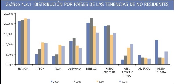 No obstante, en los últimos diez años Japón casi ha duplicado la tenencia de papel español, mientras que China (en el grupo de Asia, África y otros) aumentó del 2% al 20% (diez veces más) la posesión de deuda pública española desde el año 2000.
