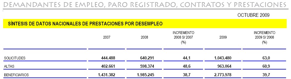 En octubre, el número de parados sin maquillaje estadístico ascendía a 4.301.686 personas. En ese mismo mes el número de beneficiarios de prestaciones por desempleo crecía hasta los 2.773.978, un 39,7% más que en octubre de 2008.