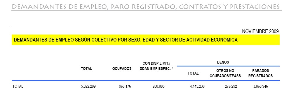 De nuevo, el tippex de Corbacho deja fuera a "Otros Desempleados no Ocupados" (DENOS), Trabajadores Eventuales Agrarios (TEASS), demandantes de empleo especial y demandantes de empleo con disponibilidad limitada. Todos ellos demandantes de empleo no ocupados, es decir, parados. Dentro de estas partidas, Trabajo saca de las listas oficiales casi medio millón de parados (485.177).