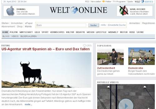 Die Welt destaca además la caída del euro como consecuencia de la noticia y de los mercados bursátiles, en especial el madrileño. Además, pregunta a sus lectores en una encuesta si cree que debería romperse la unión monetaria.