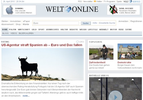 Lo más llamativo, sin embargo, es la imagen que ilustra la noticia: una imagen del toro de Osborne, convertido en icono de nuestro país y de la difícil situación por la que pasa mientras se especula sobre el declive de su imagen. Casualidad o más bien síntoma de cómo se ve España en el extranjero, el diario Die Welt escoge idéntica imagen para referirse, con el mismo pesimismo, a la situación de nuestro país. El periódico, en su página web, habla del "dramático desarrollo" de la crisis en los mercados financieros con la decisión de la agencia estadounidense. Por encima de sus tristes vaticinios, de nuevo, la fotografía del popular cartel, convertido en icono.