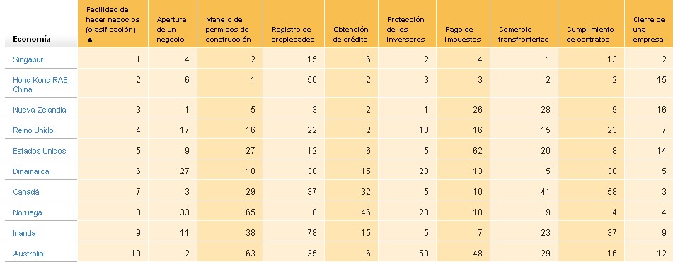 Singapur lidera un año más (ya es el quinto consecutivo) el ranking internacional de facilidad para hacer negocios, seguido de Hong Kong, Nueva Zelanda, Reino Unido, EEUU, Dinamarca, Canadá, Noruega, Irlanda y Australia. De las 25 economías que lideran el ranking, 18 facilitaron aún más la realización de negocios el año pasado.