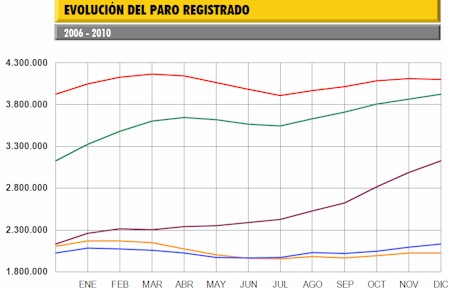 Así pues, España cerró 2010 con 174.627 desempleados más respecto a 2009 (un aumento del 4% interanual). Sigue siendo la cifra más elevada de toda la seria histórica comparable (desde 1996). En apenas tres años, desde que comenzó la crisis, el número de parados en España se ha más que duplicado, al pasar de 2.129.547 en diciembre de 2007 a más de 4,5 millones a cierre de 2010 (casi 2,5 millones de parados más).