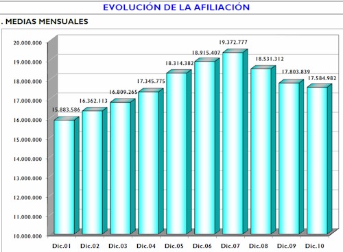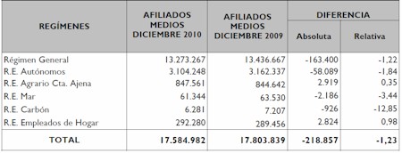 Al drama del paro se suma, además, la destrucción de empleo que sigue sufriendo la economía nacional. La Seguridad Social cerró 2010 con un descenso medio de 218.857 afiliados (-1,23%), tras registrar en diciembre 27.728 cotizantes menos (-0,16%). La pérdida de afiliados en 2010 es más de tres veces inferior a la registrada en 2009, cuando el sistema experimentó un descenso de cotizantes superior a las 727.000 personas. Se trata, además, del menor descenso anual de afiliados desde que se inició la crisis, aunque la cuestión es que España sigue destruyendo empleo.