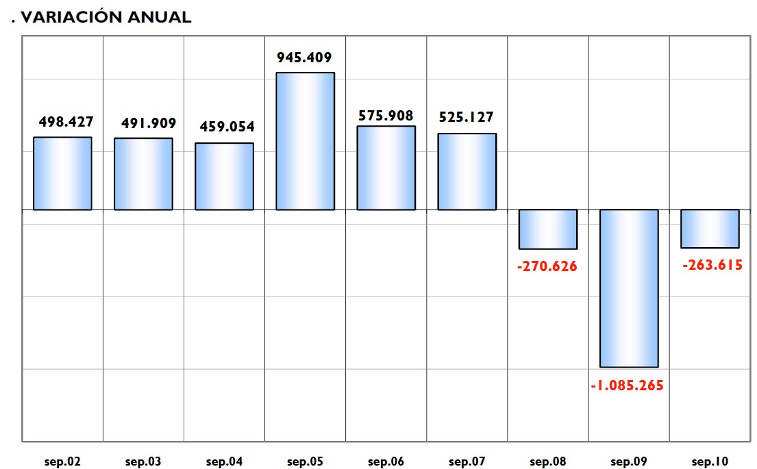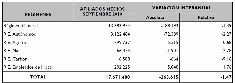 También se registraron descensos mensuales de la afiliación en el Régimen del Hogar, que perdió 2.050 cotizantes (-0,7%); en el del Mar, donde cayó en 919 ocupados (-1,36%), y en el del Carbón, con 107 bajas (-1,59%). En septiembre sólo subió la afiliación en el Régimen Agrario, que ganó 26.899 cotizantes en el mes (+3,48%).