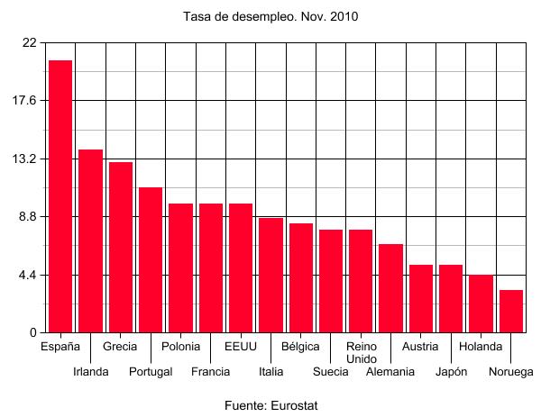 Pero el verdadero hombre enfermo de Europa es España que, con una tasa del 20,6%, duplica la media de los 27 (9,6%), triplica la de Alemania, cuadruplica de sobra la de Holanda (4,4%) y quintuplica la de Noruega (3,6%). Fuera del continente Estados Unidos se sitúa en el 9,8%, tasa igual a la que registran países del G8 como Francia y superior a la de Italia (8,7%), Bélgica (8,3%) y el Reino Unido (7,8%). Japón, sin embargo, se sitúa en la parte baja de la tabla con un modesto y esperanzador 5,1%