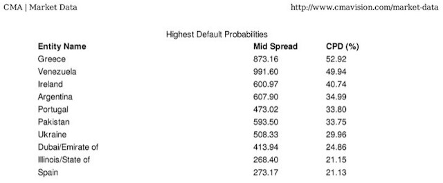 El top ten es liderado por Grecia, cuyos CDS superan los 873 puntos (probabilidad de quiebra del 53%), Venezuela (casi 50%) e Irlanda (40,7%).