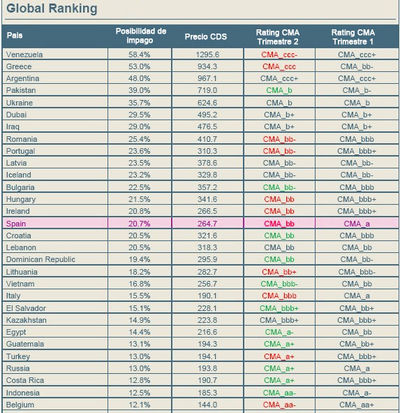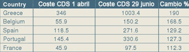 Entre el 1 de abril y el 30 de junio, los CDS sobre bonos españoles se encarecieron en un 129%, desde los 118.500 dólares por cada 10 millones de deuda pública asegurada hasta los 271.600 dólares. Es la tercera peor subida del mundo tras la sufrida por Grecia (190%) y Bélgica (168%).