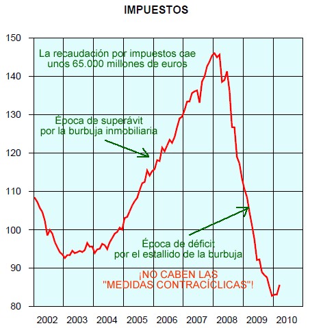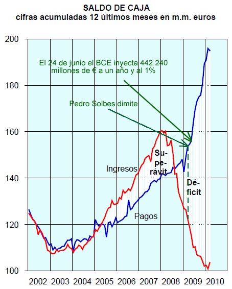 El Gobierno disparó el gasto público desde inicios de 2009 bajo el argumento de que los "estímulos" permitirían el inicio de la recuperación económica, mientras los ingresos fiscales se desplomaban como resultado del fin de la burbuja inmobiliaria. Todo ello se materializó en un déficit público histórico y en la consiguiente emisión récord de deuda, que el Tesoro logró colocar en el sistema financiero español con la inestimable ayuda del BCE.