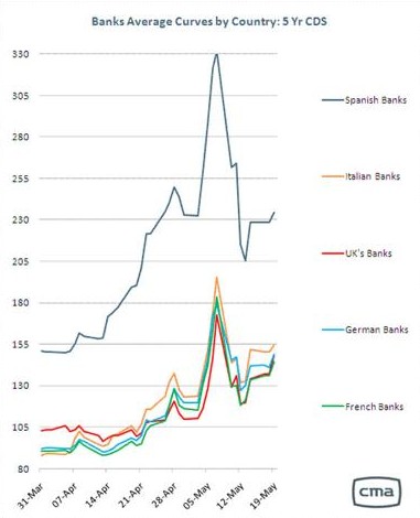 Pero no sólo se disparó el coste de asegurar deuda pública sino también privada, sobre todo, bancaria debido a su elevada exposición a este tipo de activos. Los CDS de la banca española se dispararon hasta los 330 puntos básicos (330 dólares al año) durante esos días de alta tensión, muy por encima de los bancos italianos o alemanes.