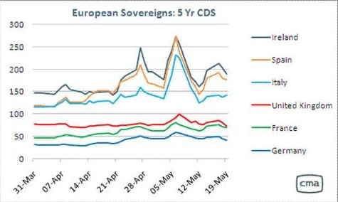 Esto se reflejó de inmediato en los seguros de impago de deuda (credit default swaps, CDS), tanto pública como privada. Así, los CDS de los bonos del Tesoro español alcanzaron su valor máximo en la semana del 3 al 7 de mayo, en donde los inversores llegaron a pagar más de 250.000 dólares al año para garantizar la compra de 10 millones en bonos a cinco años (más de 250 puntos básicos), todo un récord, según los datos de CMA Datavision.