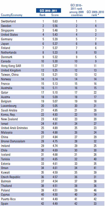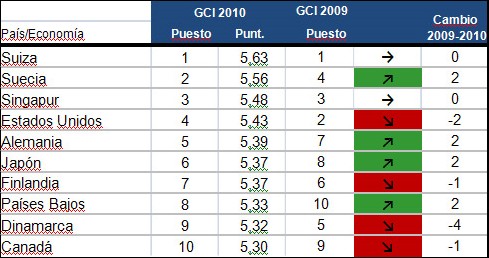 Los diez países que encabezan la clasificación son, por este orden, Suiza (5,63), Suecia (5,56), Singapur (5,48), Estados Unidos (5,43), Alemania (5,39), Japón (5,37), Finlandia (5,37), Holanda (5,33), Dinamarca (5,32) y Canadá (5,30). Suiza mantuvo el primer puesto en la lista de economías más competitivas del mundo, mientras que Estados Unidos cayó a la cuarta posición.