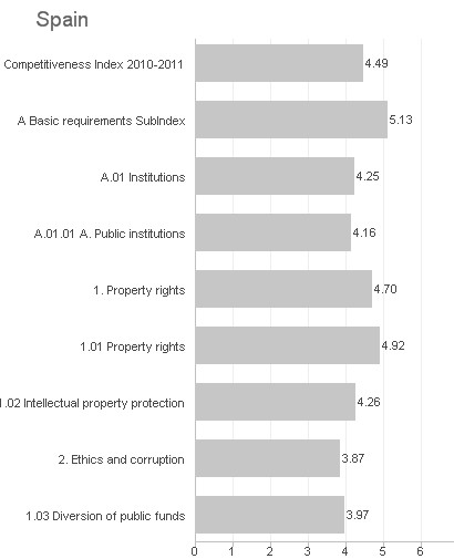 Según el informe, la brusca caída de la competitividad española "es en gran parte atribuible a un crecientemente negativo cálculo de los mercados laborales y financieros, además de por el nivel de sofisticación de los negocios del país". Entre los aspectos positivos, destaca su adecuación tecnológica (puesto 30, uno menos que en 2009) y su alto nivel de infraestructuras (14º).