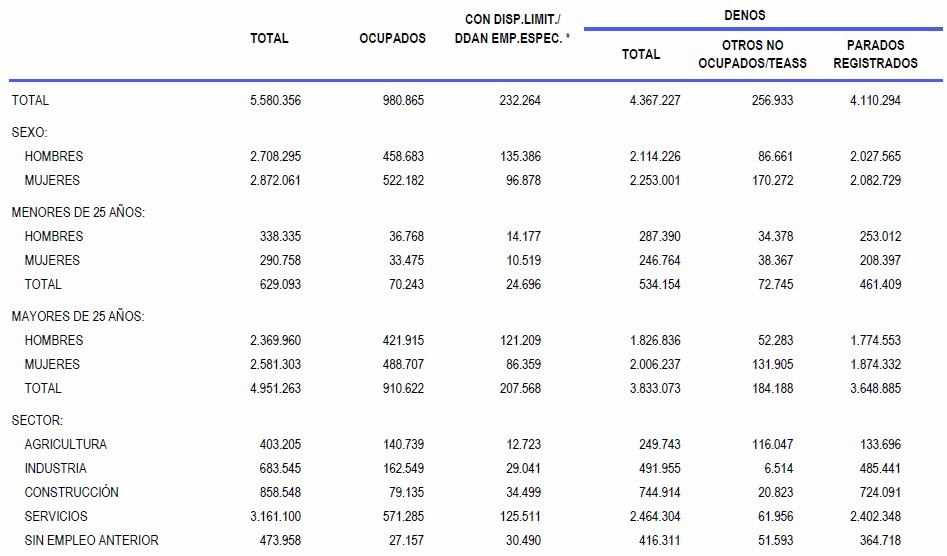Además, el Ministerio que dirige ahora Valeriano Gómez tampoco incluye en las listas oficiales a los 256.933 parados agrupados bajo el título de demandantes de empleo con "disponibilidad limitada" o "demanda de empleo específica". Estas personas, según afirma el antiguo Inem, "son aquellos demandantes, sin empleo, que indican en su solicitud condiciones especiales de trabajo". Es decir, que son también parados.