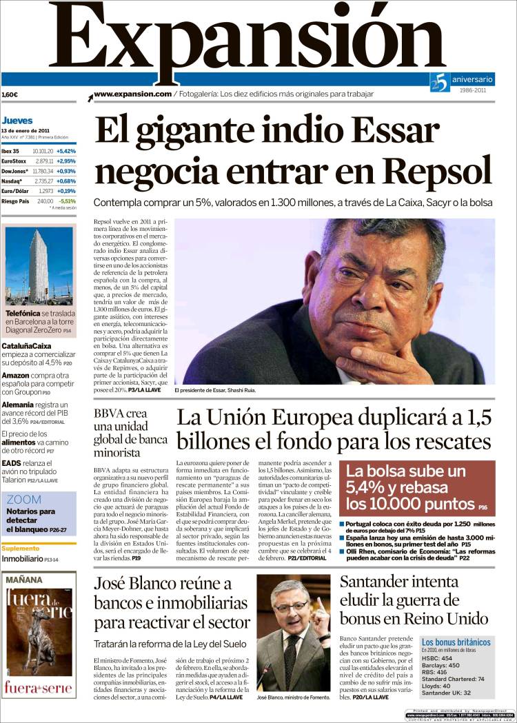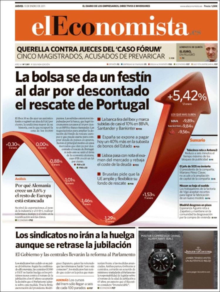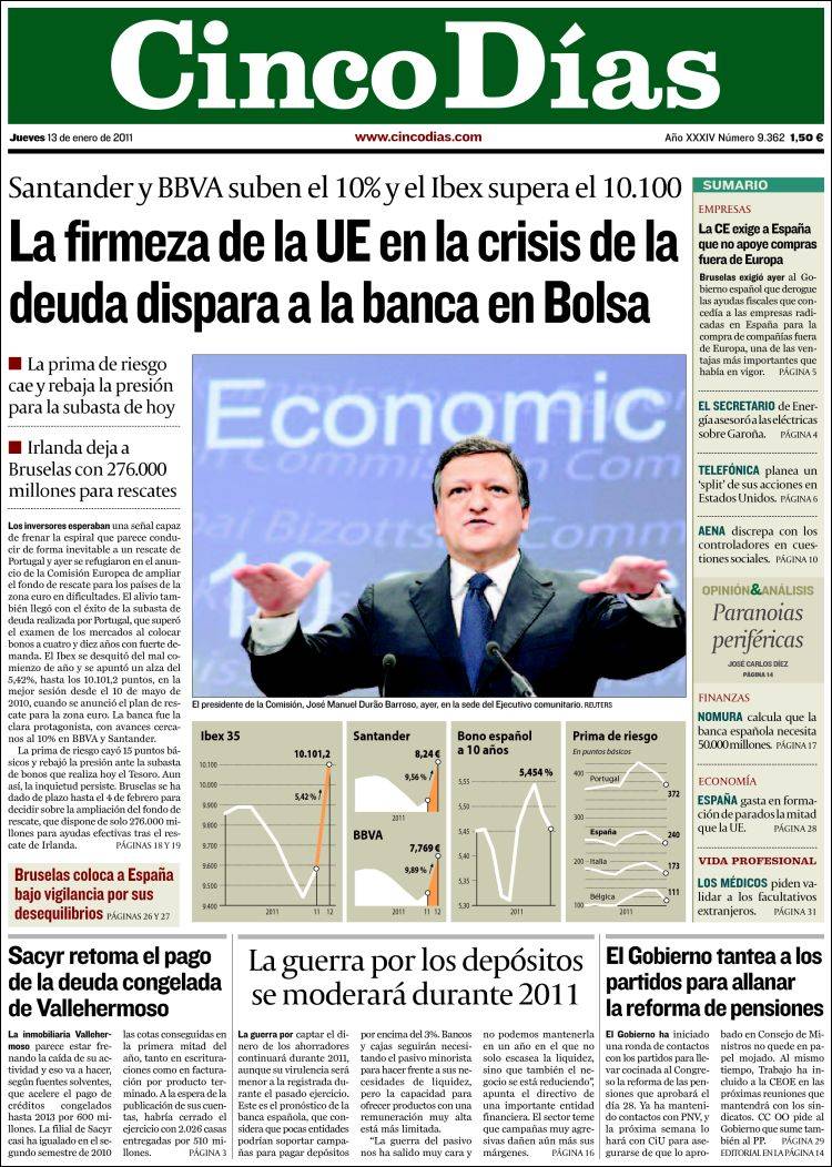 Finalmente, el económico de Prisa, Cinco Días, indica que "la firmeza de la UE en la crisis de la deuda dispara a la banca en Bolsa" y cifra en 276.000 millones de euros el dinero que queda en el fondo de rescate comunitario antes de que sea ampliado, tras el rescate griego e irlandés.