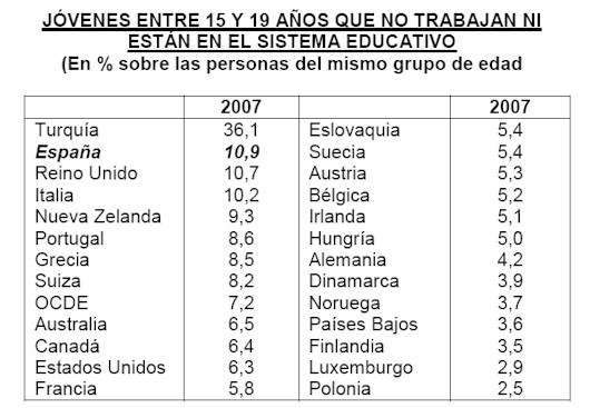 España es el segundo país de la OCDE, primero de la UE, con más jóvenes de entre 15 y 19 años inactivos -que no están trabajando ni siguen formándose-, con un porcentaje del 10,9% y sólo por detrás de Turquía (36,1%), según datos de la OCDE recogidos por el Instituto de Estudios Económicos (IEE).