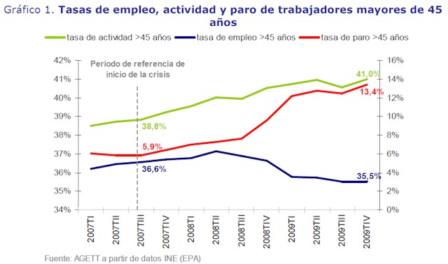 España cerró el pasado año con una tasa de paro del 18,8%. El colectivo de los trabajadores mayores de 45 años ha visto cómo su tasa de paro se ha duplicado desde el inicio de la crisis, pasando del 5,9% en el tercer trimestre de 2007 al 13,4% a finales del pasado año.