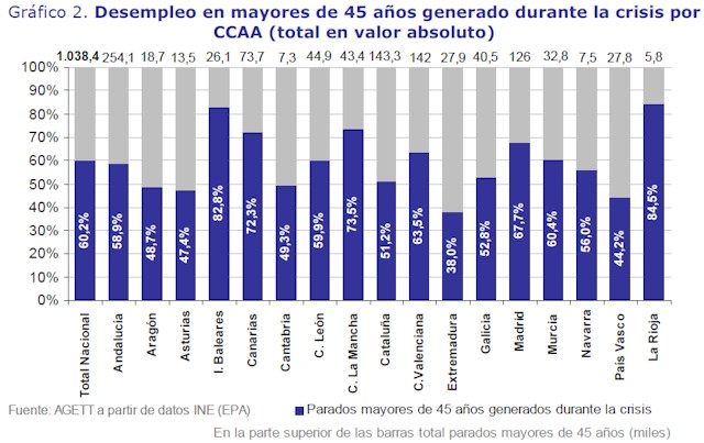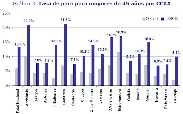 Canarias lidera el paro de mayores de 45 años, con una tasa del 21,3% (8 puntos porcentuales más que la media nacional). Esta región es, a la vez, la que ha sufrido un mayor incremento en dicha tasa desde que comenzó la crisis, con 14,4 puntos porcentuales. Le siguen Andalucía (20,9%), Extremadura (16,9%) y Comunidad Valenciana (16,7%). Por el contrario, las comunidades mejor posicionadas son Navarra (6,9%) y País Vasco (7,2%).