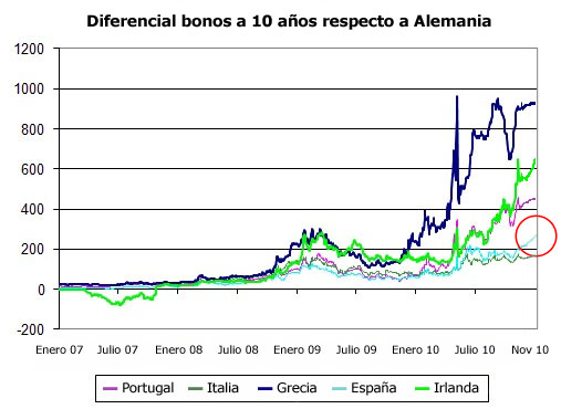 En segundo lugar, y mirando el pasado reciente (ver gráfico superior), la situación española también es preocupante. Hace apenas ocho meses, el diferencial de los bonos irlandeses y portugueses estaba por debajo de los 200 puntos básicos y este lunes se situaba en 624 y 408 puntos respectivamente. El país celta ya ha aceptado el rescate del FMI y la UE, y los mercados dan por descontado que los lusos serán los siguientes. Ahora mismo, España sigue lejos de sus niveles, pero la evolución de su deuda parece seguir paso a paso el camino que marcaron aquellos dos países en la primavera de este 2010.