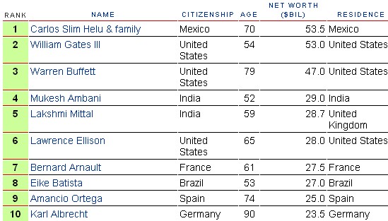 El magnate mexicano de las telecomunicaciones Carlos Slim, con una riqueza valorada en los 53.500 millones de dólares, arrebata la corona del hombre más rico del mundo al fundador de Microsoft, Bill Gates, quien ha dominado la lista Forbes durante 13 de los últimos 15 años y cuyos activos están valorados actualmente en 53.000 millones de dólares.