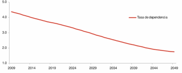 Número de españoles en edad activa por jubilado (Fuente: Fedea; pag. 11)