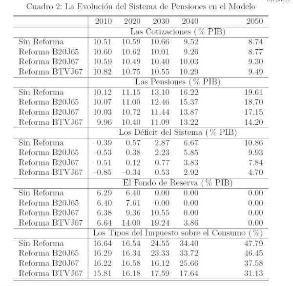 Según sus cálculos, ampliando la edad de jubilación a 67 años y el cálculo de la base a toda la vida laboral, la Seguridad Social quebraría en 2042. Y ello, pese a que la pensión media caería un 26% (ver cuadros).