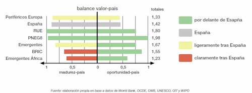 En este sentido, la Figura 1 muestra, para cada uno de los grupos de países considerados y España, la visión consolidada que reflejan los indicadores tanto de madurez-país (mitad izquierda de las barras del gráfico) como de oportunidad-país (mitad derecha de las barras del gráfico).